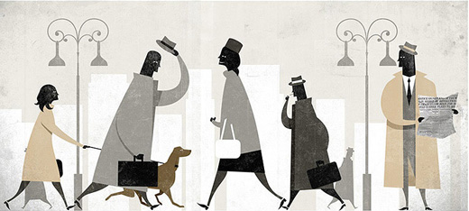 I love the elegance of these illustrations. Simple curves and shapes with characters and buildings with a look so delicate that it suggests a strong breeze could up-root them. Tie in the gentle, muted colours with the textures and I’d love to see hanging in my favorite coffee shop.